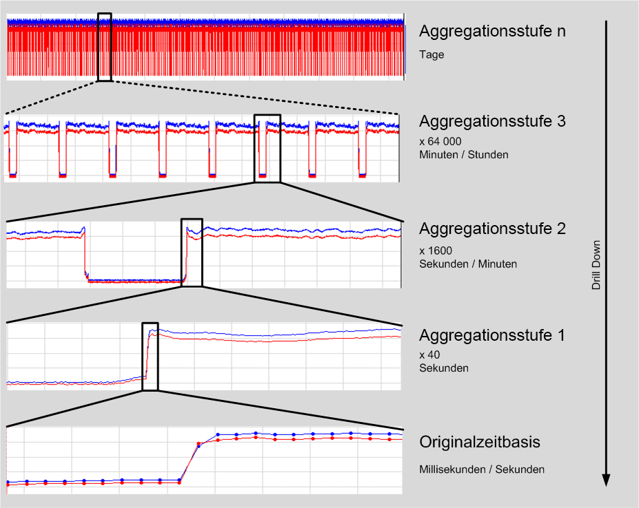 Das Einzoomen in die Signalkurve wird durch diese Form der skalierten Datenablage erheblich beschleunigt.