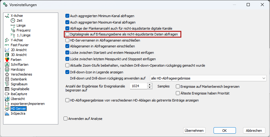 Ab Version 7.3 von ibaAnalyzer gibt es in den Voreinstellungen im Register HD Server eine neue Option Digitalsignale auf Erfassungsebene als nicht-äquidistante Daten abfragen. Mit dieser Option ist es möglich, immer digitale Signale als Rohdaten abzufragen, unabhängig von der Verdichtungsstufe und der gewählten Zeitbasis der Abfrage, die für analoge Werte verwendet wird. Insbesondere bei Langzeitabfragen ist es so möglich, die Dauer korrekt zu messen oder Zeitstempel von Wertänderungen auszuwerten, ohne die üblichen Fehler, die durch die Datenverdichtung auf dem ibaHD-Server entstehen.