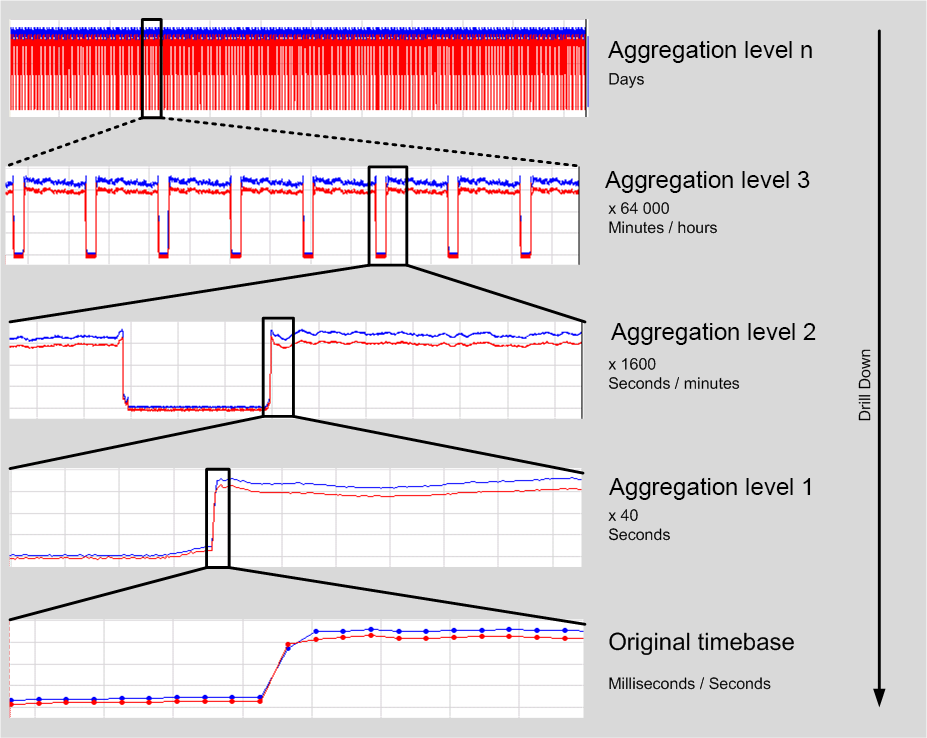 The following figure shows the principle of data aggregation or, conversely, drill-down.