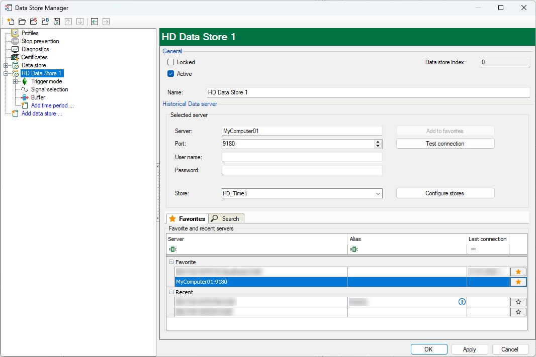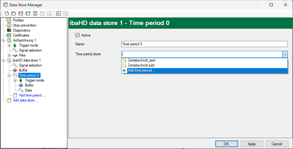 Only time periods that are not yet being written/used by a HD store are displayed. If no time period store has been configured yet, you can open the configuration of the HD store via the Add time period entry.