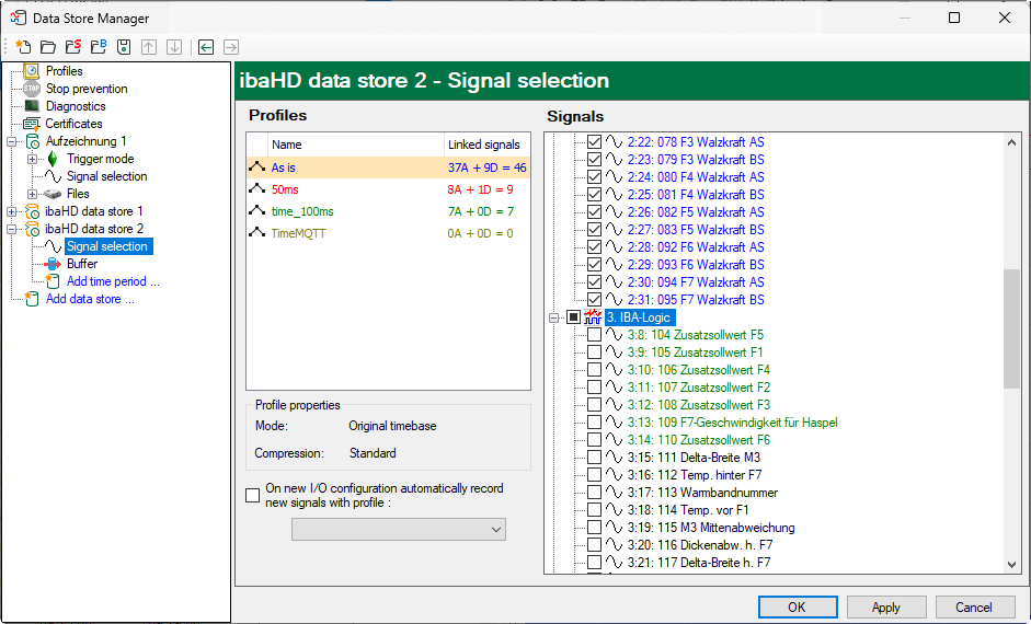 After the time-based HD data store was configured, the signals which shall be recorded there, must be selected. The signal selection is carried out in the same way as for normal data store with ibaPDA. Select the "Signal selection" link in the tree beneath your established data store.
