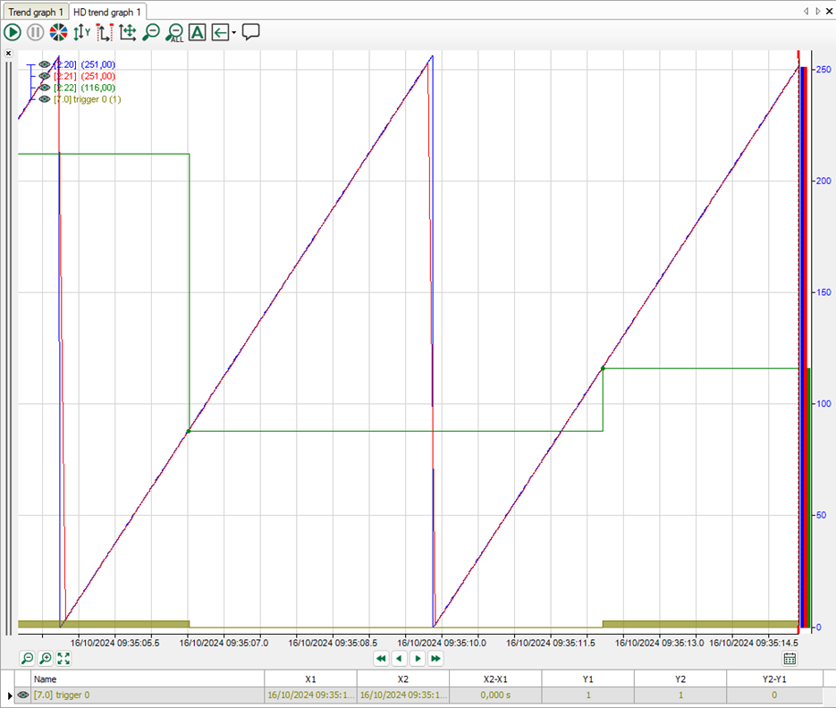 Das grüne Signal stellt eine nicht-äquidistante Version des blauen Signals dar: Jedes Mal, wenn sich der Wert des gelben Signals ändert, wird ein Wert abgespeichert. Diese Werte werden als grüne Punkte dargestellt. Das Signal wird bis zum nächsten Wert als konstant betrachtet. Aus diesem Grund wird das grüne Signal schrittweise dargestellt. Solange Sie sich in der Rohdatenebene befinden, sehen Sie die Punkte. Wenn Sie weiter herauszoomen, bis die erste Aggregationsstufe erreicht ist, werden keine Punkte mehr gezeichnet.