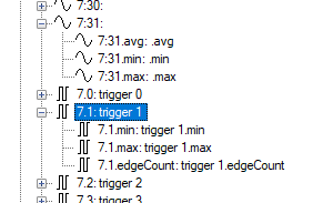 Wenn Sie in im HD-Signalbaum die Option Sub-Signale anzeigen aktiviert haben, werden aus den Aggregationsstufen die Werte für Minimum, Maximum und Durchschnitt bei Analogsignalen, und die Werte Minimum, Maximum und Flankenzahl bei Digitalsignalen angezeigt.