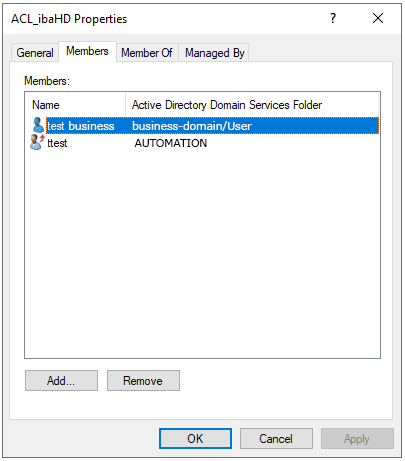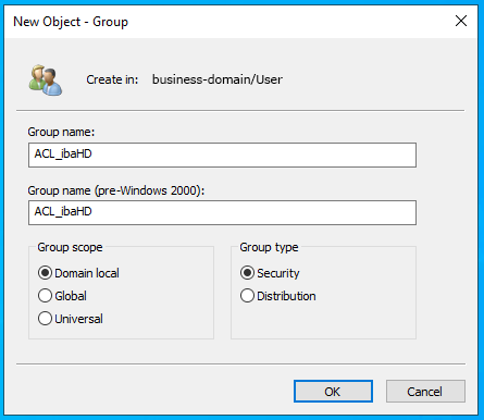 First create a group in the Active Directory user and group management in the business-domain in which the ibaHD-Server is located, e.g. ACL_ibaHD.