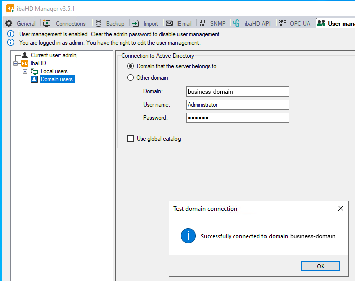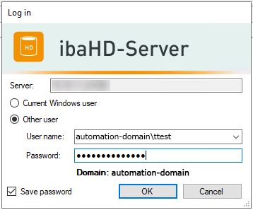 Finally, test the access by successfully logging in from both systems (ibaAnalyzer client and ibaHD-Server) and accessing the ibaHD-Server.