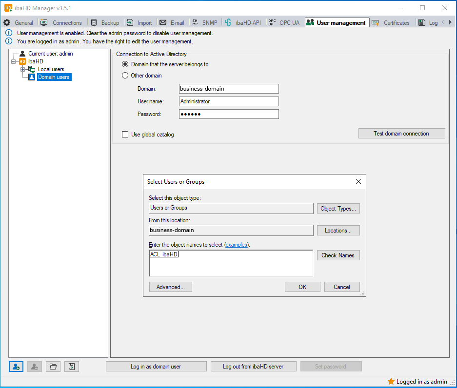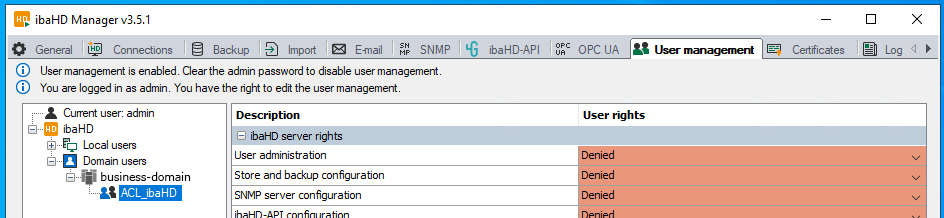 Store the ACL_ibaHD group in the user administration of ibaHD-Server. To do this, first link the business-domain to the system.