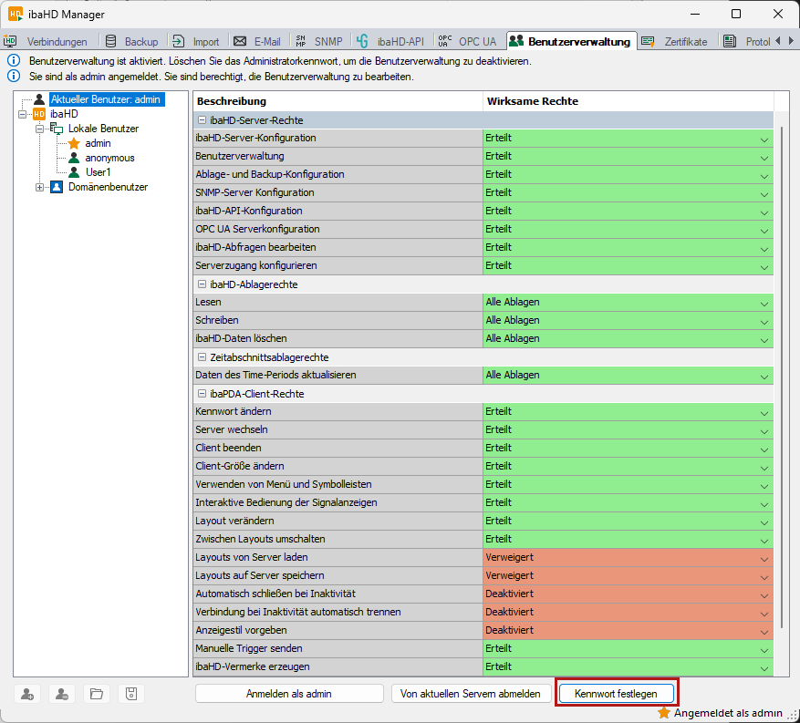 Solange für den Benutzer admin kein Kennwort vergeben wurde, ist die Benutzerverwaltung von ibaHD-Server deaktiviert und jeder ibaPDA-Client meldet sich beim ibaHD-Server als admin an. Somit haben alle Clients alle Rechte.