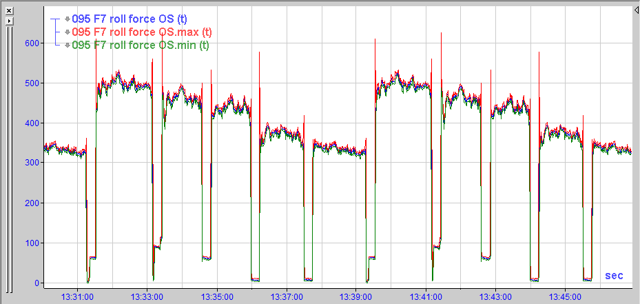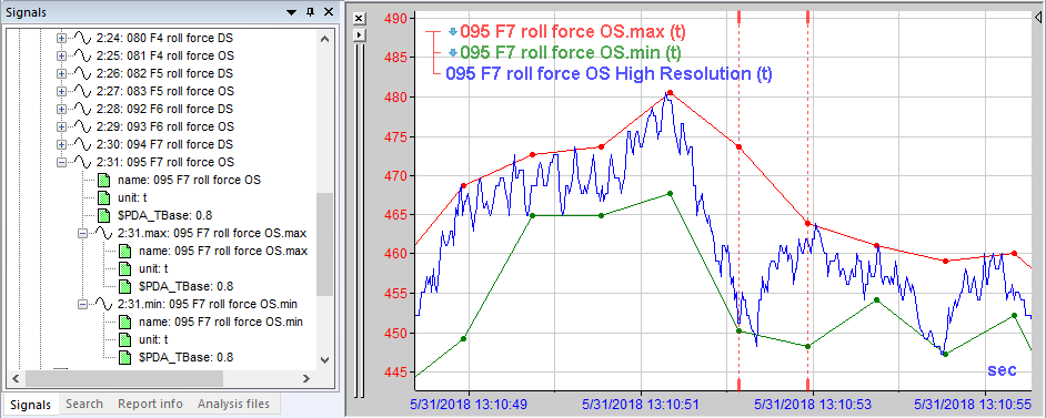 In der folgenden Abbildung sehen Sie im Signalbaum den Messwert und die Unterkanäle für max und min. Der Signalstreifen zeigt die dazugehörigen Kurven in Rot und Grün. Die blaue Kurve zeigt zum Vergleich die hochaufgelösten Daten.