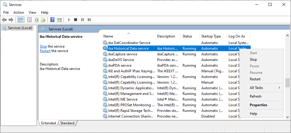 To have a look at the settings of the services, right-click on the service "iba Historical Data service" and select "Properties".