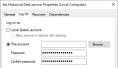 ibaHD-Server is a service under Windows. A Windows service runs under a user name, that means that a certain user account, provided during installation, has been assigned to it. The user account must have administrator rights. The default setting is the local system account which has administrator rights for the local computer.
