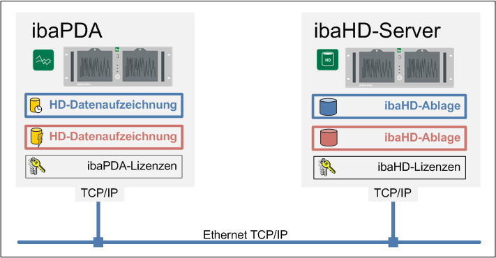 Werden ibaPDA und ibaHD-Server auf getrennten Rechnern installiert, dann werden die jeweiligen Lizenzen für ibaPDA und ibaHD-Server in getrennten Lizenzcontainern (Dongles oder Soft-Lizenzen) benötigt. |