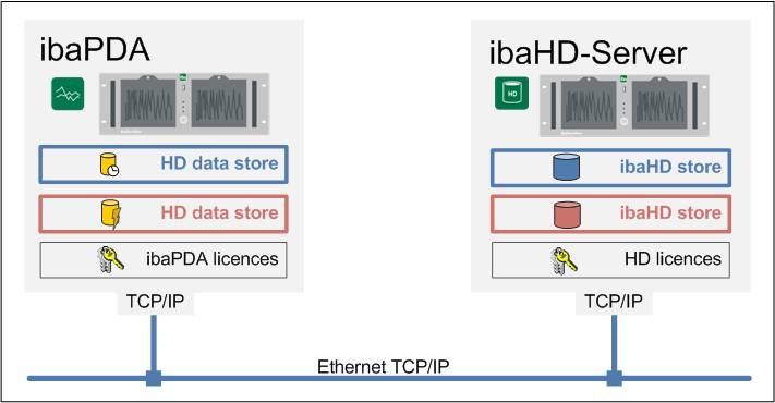 If ibaPDA and ibaHD-Server are installed on separate computers, the respective licenses for ibaPDA and ibaHD-Server are required in separate license containers (dongles or soft licenses). |