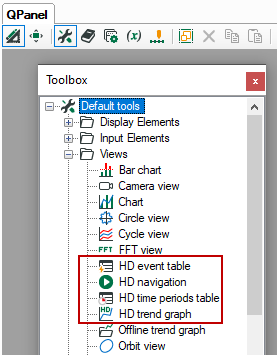 The list of the tools contains also the display elements "HD event table," "HD trend graph" and "HD navigation" which are used for the visualization of data from ibaHD-Server.