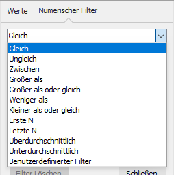 Die Filterkriterien der erweiterten Filter sind abhängig vom Typ des Spaltenwerts. So hat z. B. eine Spalte mit numerischen Werten andere Filteroptionen als eine Spalte mit Datum.
