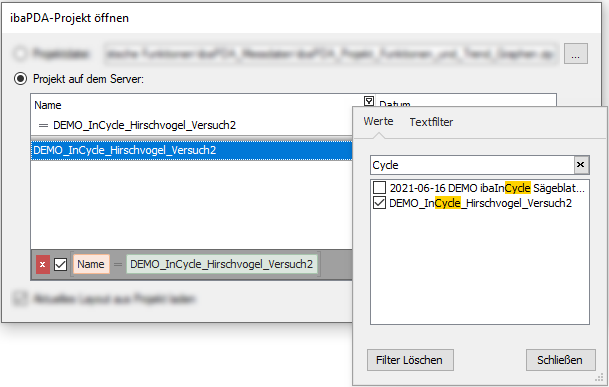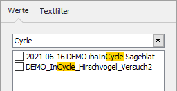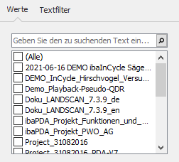 Das Register Werte enthält eine Liste aller Werte in der ausgewählten Spalte. Über der Liste ist ein Feld, in das Sie ein Suchmuster eingeben können. Zeilen, die das Suchmuster nicht enthalten, werden aus der Liste entfernt. Das Suchmuster wird in den passenden Zeilen gelb hervorgehoben.