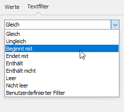 In Spalten mit Text können spezielle Textfilter genutzt werden.