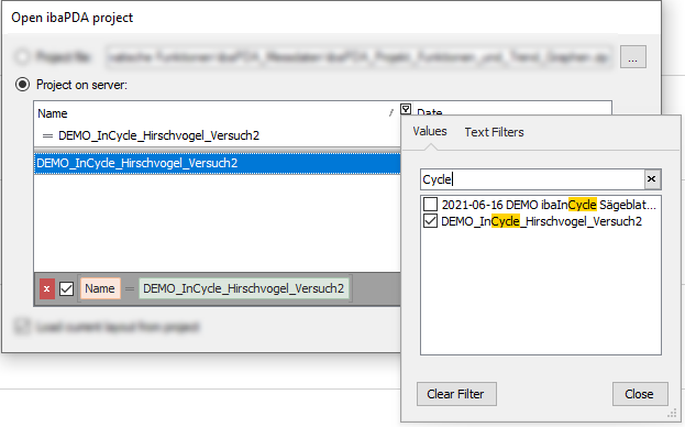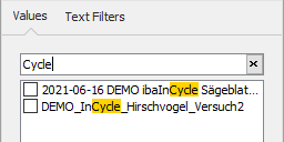 The Values tab contains a list of all values in the selected column. Above the list, there is a field where you can enter a search pattern. Rows which don't match the pattern are removed from the table. The search pattern is highlighted yellow in every matching row.