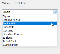 Advanced filters, to create a filter based on the value typeIn the example above, the value in the column Name, is a text and therefore the second tab is Text Filters. There would be a Date Filters tab if the value is a date and a Numeric Filters tab if the value is a number.