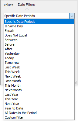 Moreover, each filter type provides a custom filter option. In case the standard filters are not suffcient for your needs you can use the custom filter option to create additional filters.