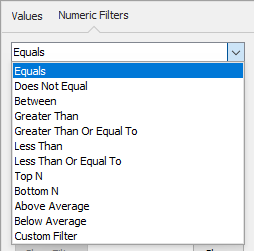 The filter options of the advanced filters depend on the column's value type. A column with numeric value, for example, has different filter options than a column with date values.