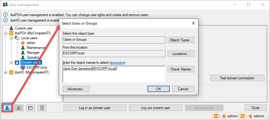Click the "Add user" button at the bottom of the tree. The tooltip for the button shows the program and computer name for which the user is created, e.g., "ibaPDA (computer name)". The "Select users or groups" dialog opens (Windows standard dialog). The default domain is set as configured in the domain settings (see figure in Establish a connection to a domain).