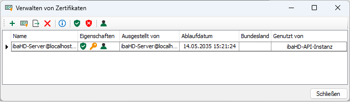 Für eine sichere Kommunikation verwendet ibaHD-API X.509-Zertifikate. Für die Kommunikation über TLS ist ein Zertifikat erforderlich. TLS-Zertifikate können vom Server bereitgestellt werden und müssen an den Client übertragen werden. Eine gRPC-API-Kommunikation kann nur dann stattfinden, wenn jeder Kommunikationspartner dem Zertifikat vertraut. Sie können auch Zertifikate registrieren und sie als "nicht vertrauenswürdig" kennzeichnen. Die Kommunikation mit einem Partner, der ein "nicht vertrauenswürdiges" Zertifikat besitzt, wird abgewiesen.