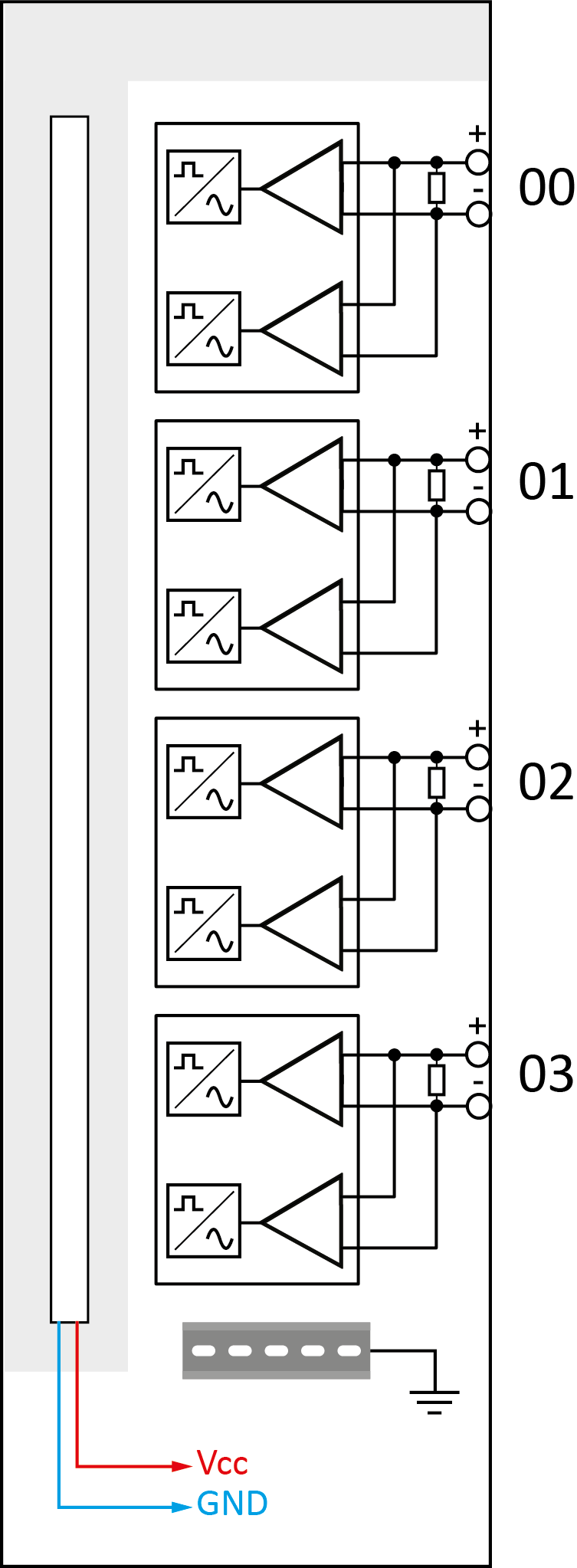 A total of 4 input signals, each bipolar and electrically isolated, can be connected here (0 ... 3). Each channel is connected using a two-wire system.