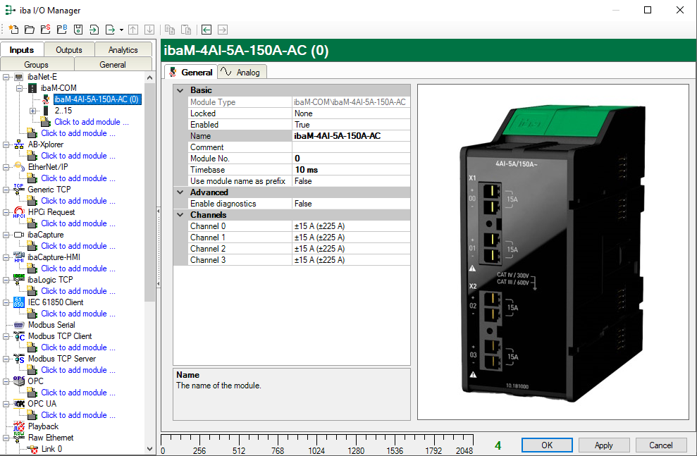 If you enable diagnostics (True), the Diagnostics tab is added. See ibaM-4AI-5A-150A-AC – Diagnostics tab.