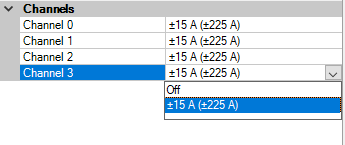 Enable the channel by selecting the measuring range or disable the channel in the drop-down menu.