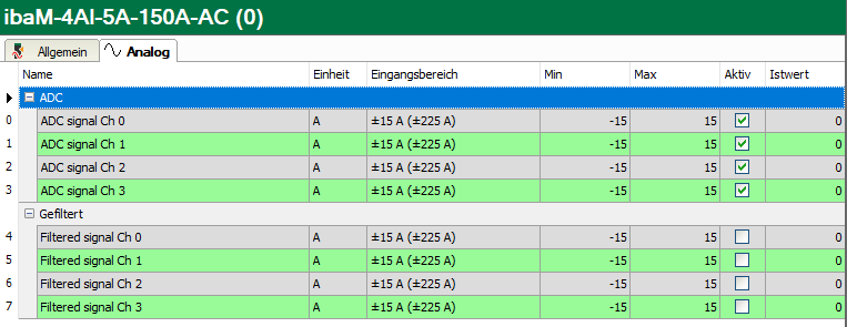 Im Register Analog werden die analogen Signale in 2 Gruppen aufgelistet. Die Gruppe ADC enthält die ADC-Signale direkt nach dem A/D-Wandler, die Gruppe Gefiltert enthält die Filtersignale mit dem zusätzlichen digitalen Antialiasing-Filter.