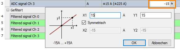 Hier können Sie eine Messbereichsunter- bzw. -obergrenze definieren. Der analoge Spannungspegel der Messbereichsunter- bzw. -obergrenze wird einer physikalischen Größe zugeordnet. Der Dialog wird mit einem Klick auf das Kreuz geöffnet.