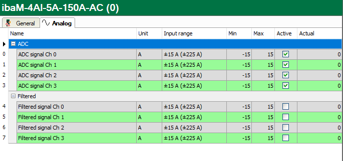 The Analog tab lists the analog signals in two groups. The ADC group contains the ADC signals directly after the A/D converter, while the Filtered group contains the filter signals with the additional digital anti-aliasing filter.