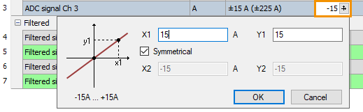 You can define an upper and lower limit for the measuring range here. The analog voltage level of the upper and lower limit is assigned to a physical variable. The dialog box is opened by clicking on the cross.