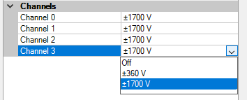 Enable the channel by selecting the measuring range or disable the channel in the drop-down menu.
