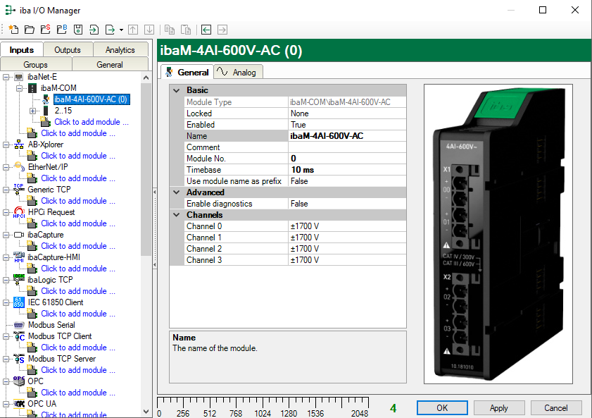 If you enable diagnostics (True), the Diagnostics tab is added. See ibaM-4AI-600V-AC – Diagnostics tab.