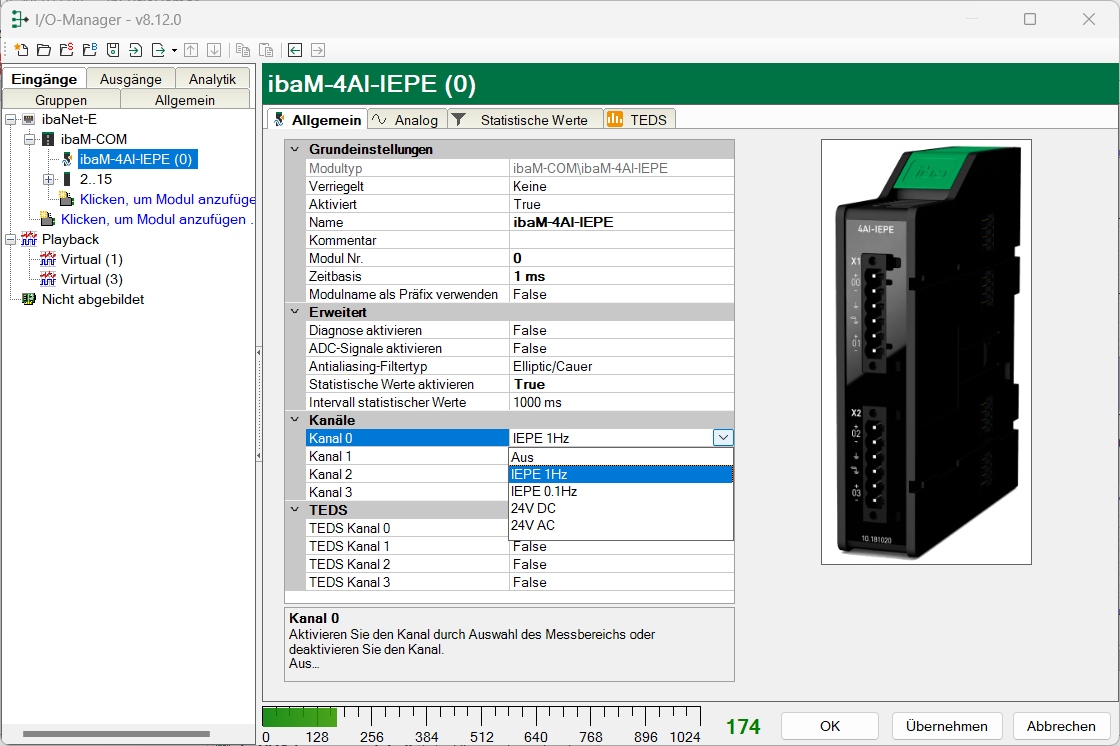 Die TEDS-Identifizierung kann nur ausgewählt werden, wenn für diesen Kanal der Modus IEPE 0.1Hz oder IEPE 1Hz ausgewählt wurde. Sind die Modi 24V DC oder 24V AC ausgewählt, bleibt das TEDS-Feld für den jeweiligen Kanal ausgegraut.