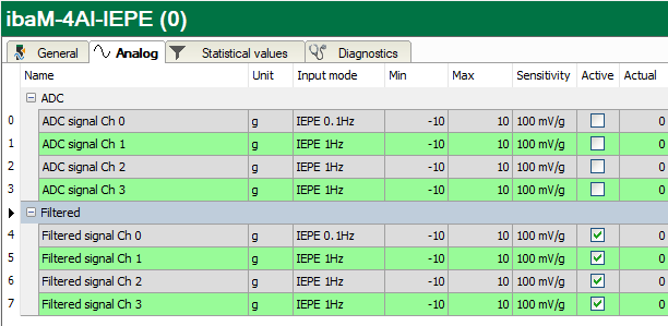 The Analog tab lists the analog signals in two groups. The ADC group contains the ADC signals directly after the A/D converter, while the Filtered group contains the filter signals with the additional digital anti-aliasing filter.