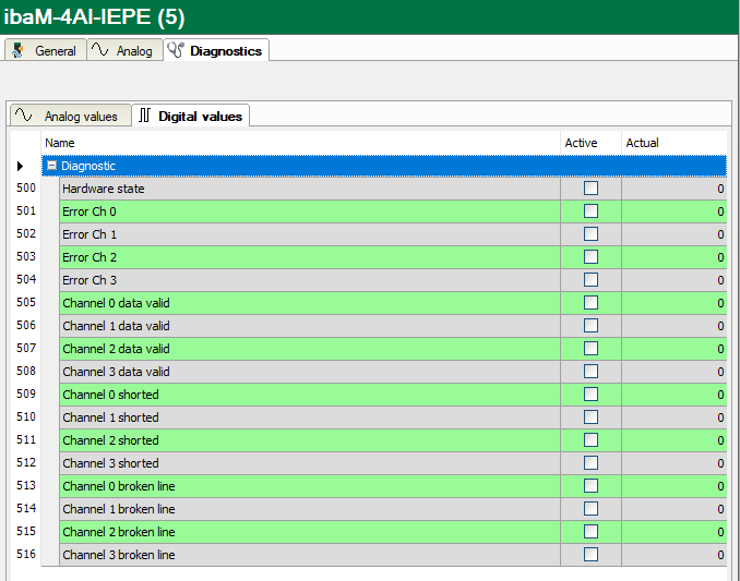 The Diagnostics tab displays the analog and digital diagnostic signals. The signals can be enabled individually.