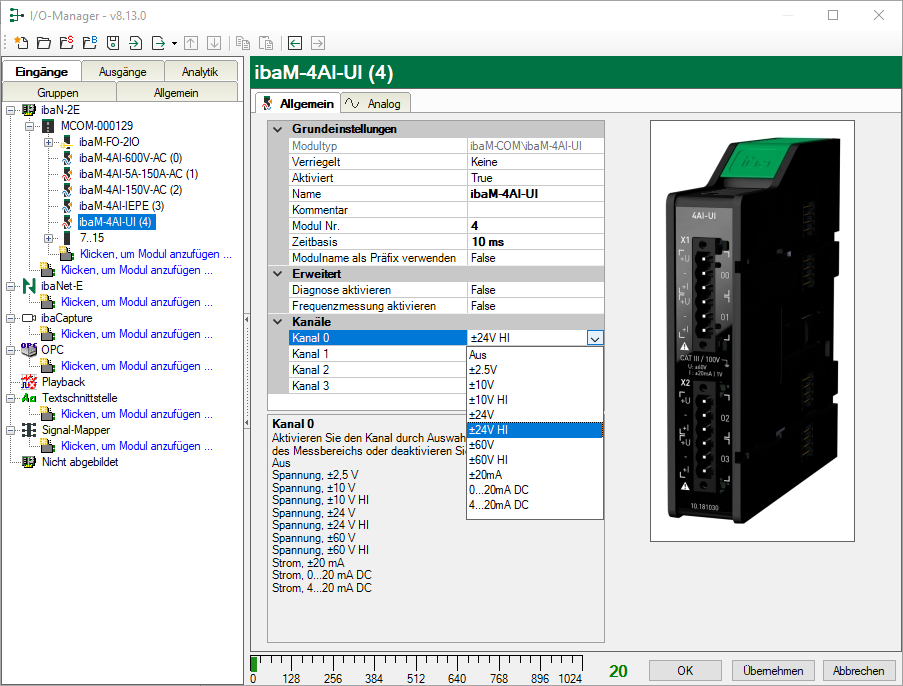 Im Register Allgemein nehmen Sie Grundeinstellungen für das Modul vor und können den Messbereich für jeden Kanal auswählen.