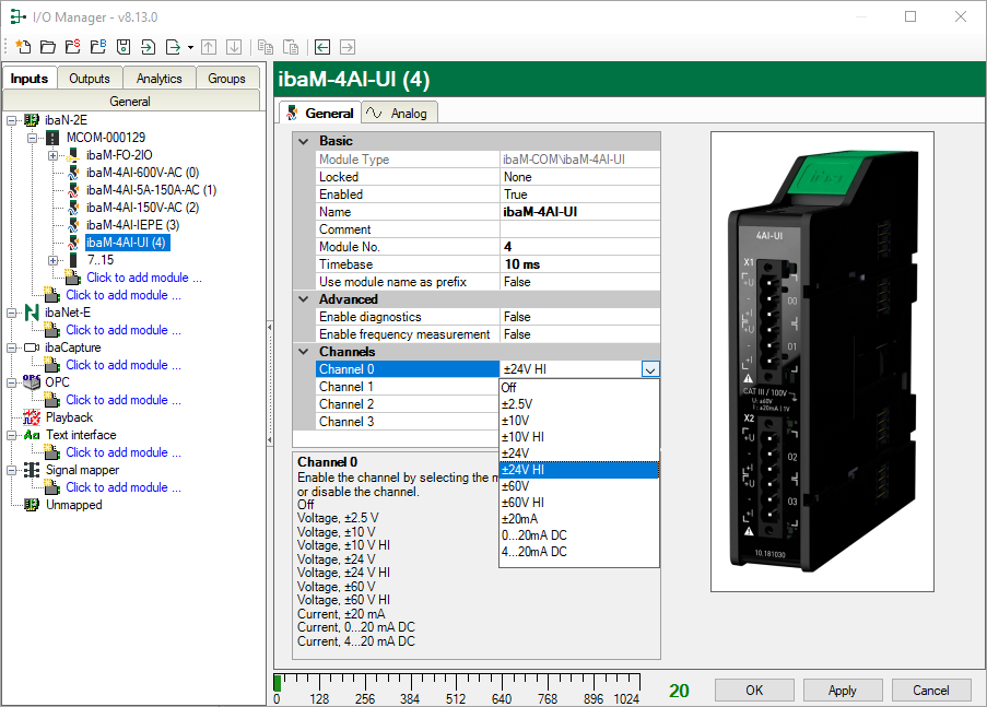 In the General tab, you can make basic settings for the module and select the measuring range for each channel.