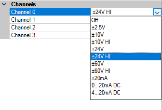 Enable the channel by selecting the measuring range or disable the channel in the dropdown list.