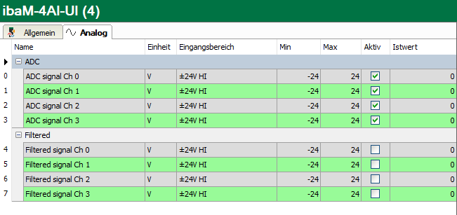 Im Register Analog werden die analogen Signale in 2 Gruppen aufgelistet. Die Gruppe ADC enthält die ADC-Signale direkt nach dem A/D-Wandler, die Gruppe Gefiltert enthält die Filtersignale mit dem zusätzlichen digitalen Antialiasing-Filter.