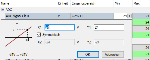 Hier können Sie eine Messbereichsunter- bzw. -obergrenze definieren. Der analoge Spannungspegel der Messbereichsunter- bzw. -obergrenze wird einer physikalischen Größe zugeordnet. Der Dialog wird mit einem Klick auf das Kreuz geöffnet.