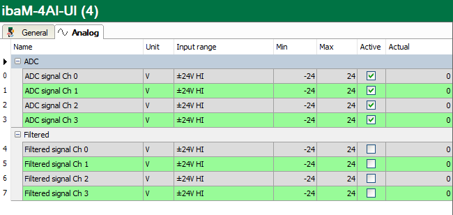 The Analog tab lists the analog signals in two groups. The ADC group contains the ADC signals directly after the A/D converter, while the Filtered group contains the filter signals with the additional digital anti-aliasing filter.