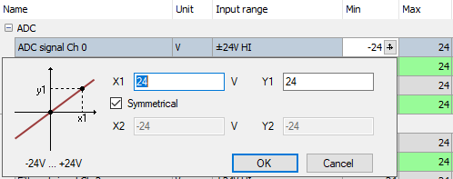 You can define an upper and lower limit for the measuring range here. The analog voltage level of the upper and lower limit is assigned to a physical variable. The dialog box is opened by clicking on the cross.