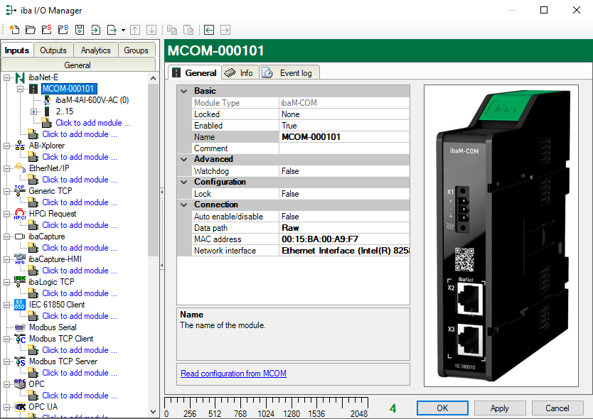 On the Discovery tab of the ibaNet-E interface, highlight the ibaM-COM device and click the <+> button.