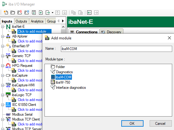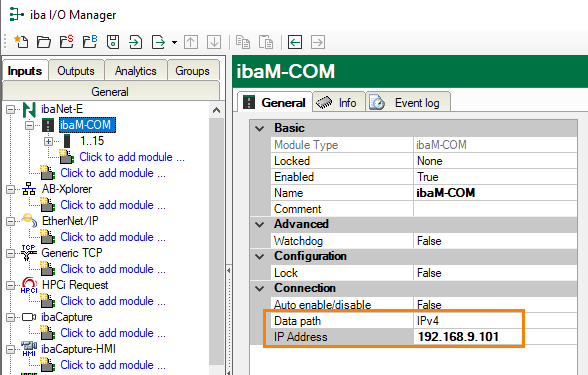 If the ibaM-COM device is not to be operated in the same LAN as the ibaPDA system, meaning it cannot be automatically located, identified and added, you can also add the device manually to the ibaNet-E interface in the I/O Manager.
