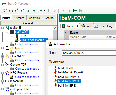 It is also possible to add the ibaM-COM device to the I/O Manager and configure it without connecting the device at the same time.