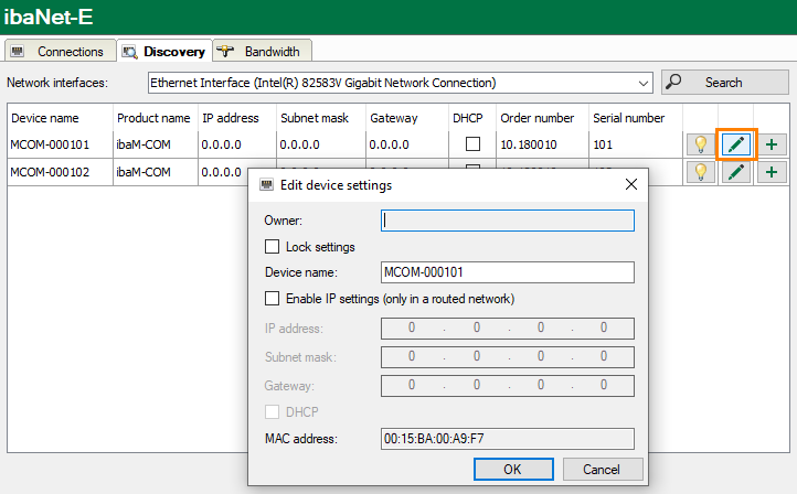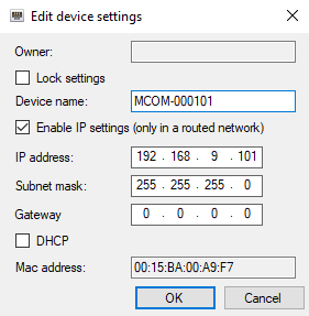 If the ibaM-COM device has already been configured, the last owner is displayed here; otherwise it is empty (when shipped, or after resetting defaults). The owner corresponds to the computer name on which ibaPDA is installed and from which this device was last configured. The entry is made automatically, and is read-only.