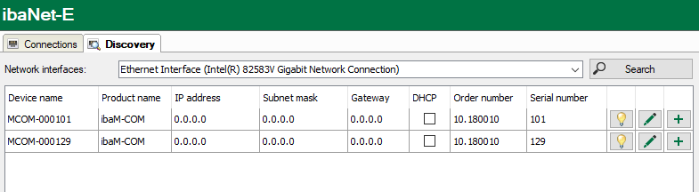 From the Network interfaces drop-down list select the network adapter(s) via which you can reach the ibaM-COM device, and start your search by clicking <Search>.